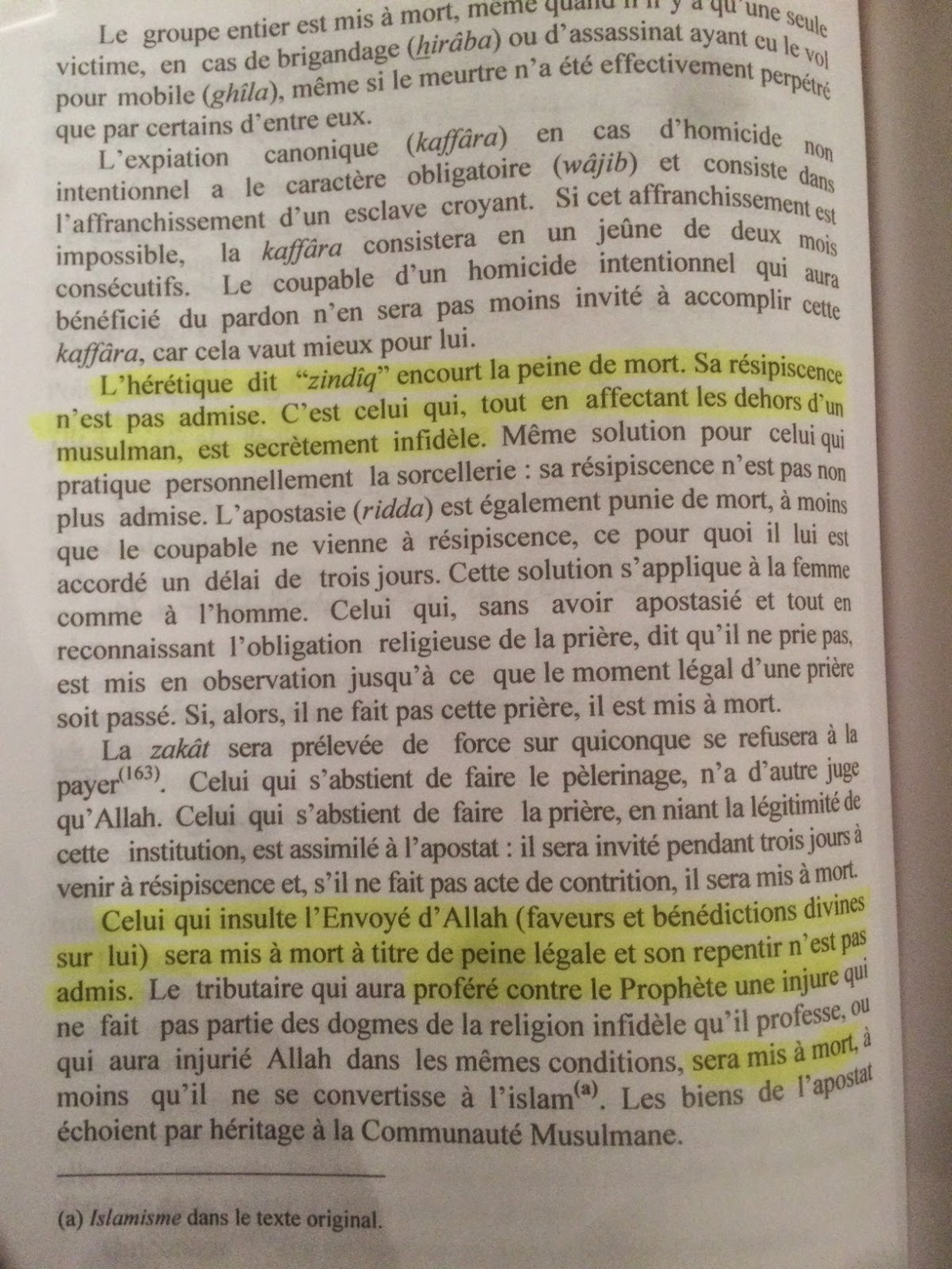 Nous avions déjà dans des articles précédents cité cet ouvrage qui recommande de tuer les homosexuels, d'attaquer les non musulmans qui refusent la conversion ou l'impôt islamique (jizya). Nous tenions à publier le scan de la page 266 de l'édition d'al Maktaba al Assyria (Beyrouth, 2004) qui explique que ceux qui insultent ou injurient le "Prophète" doivent être tués. Ceux qui négligent la prière et les apostats sont aussi condamnés à mort. Aussi, on appréciera la prescription de tuer ceux qui se disent musulmans en public sans l'être en privé, précaution dont on comprend aisément les raisons dans les zones musulmanes de France et d'ailleurs.